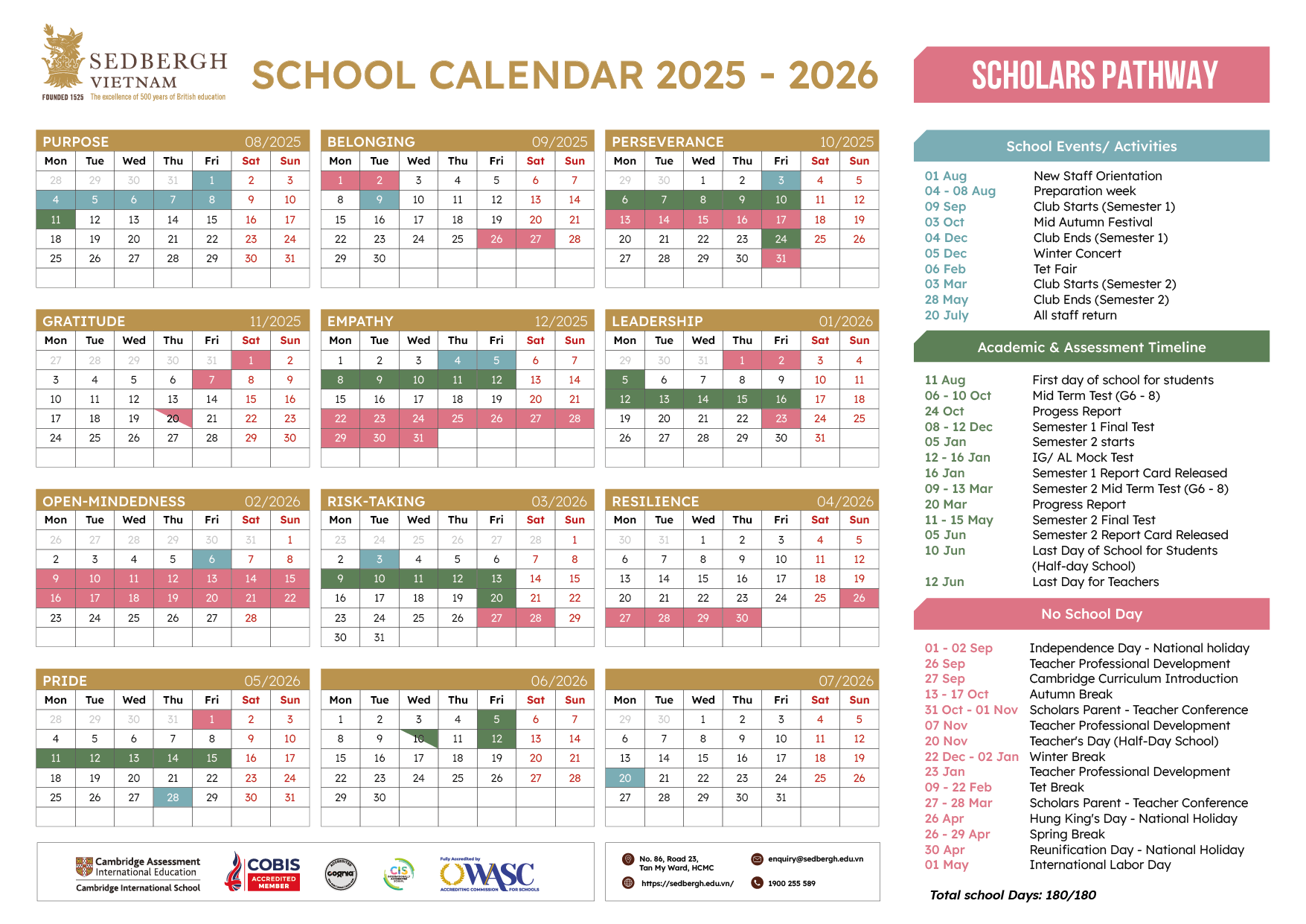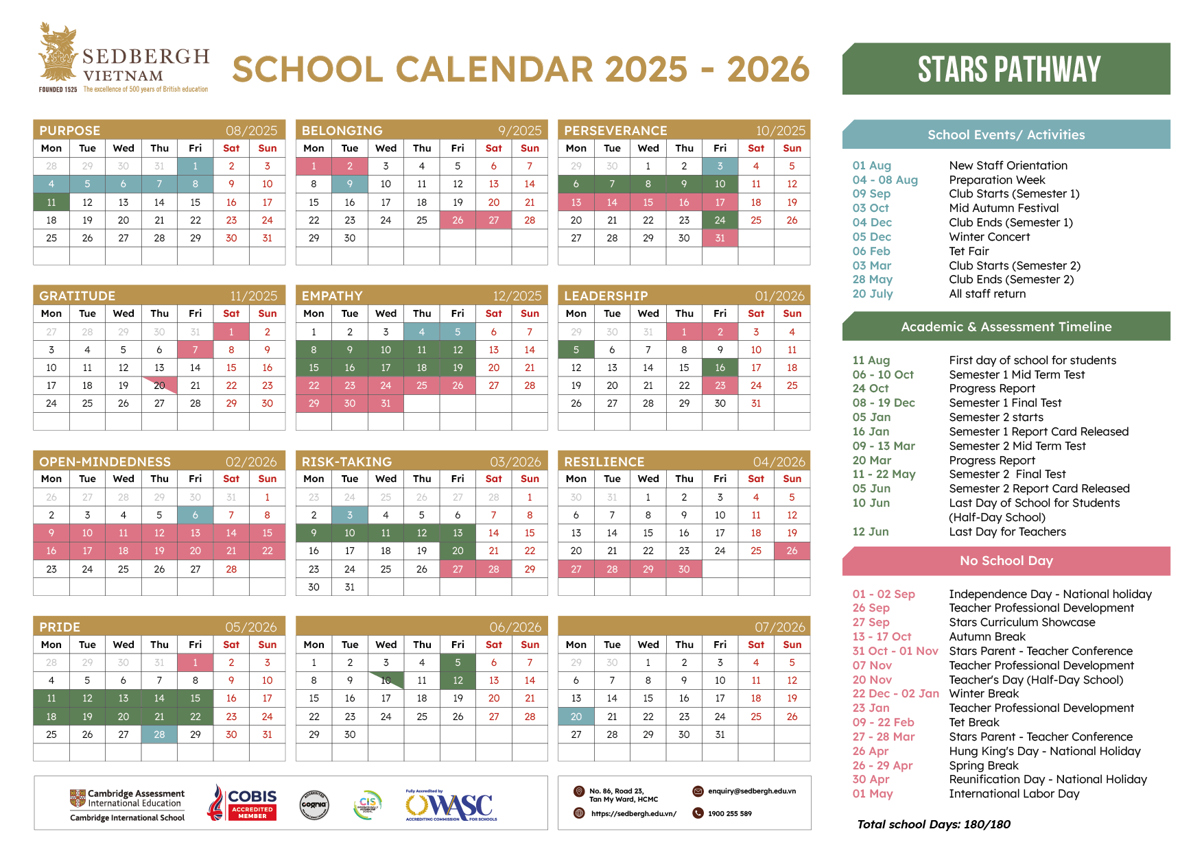SCHOOL CALENDAR AT SEDBERGH VIETNAM